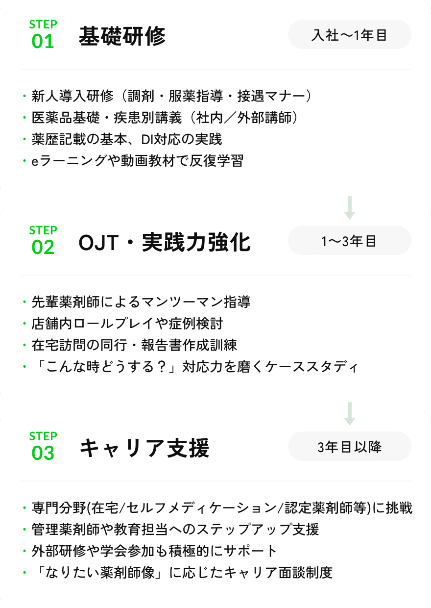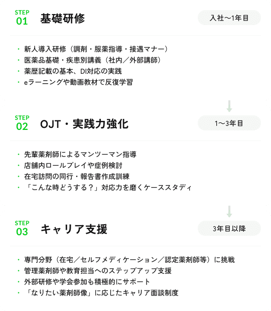 研修や実務経験を重ねながら、自分らしく成長し、患者さんにより良い薬物療法を届けられる薬剤師を一緒に目指していきましょう。